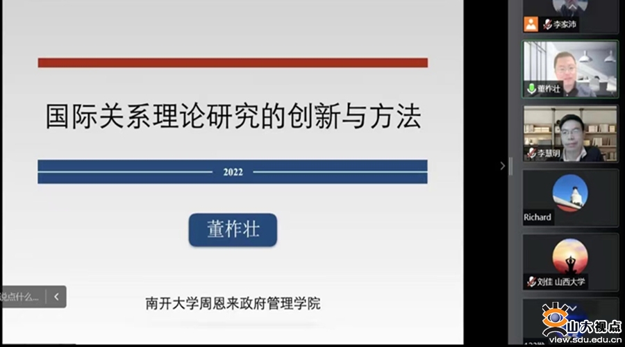 [本站讯]11月25日,国政博士生学术工作坊第二期于线上举行。南开大学周恩来政府管理学院讲师董柞壮以“国际关系理论研究的创新与方法”为题进行讲座。山东大学政治学与公共管理学院教授李慧明主持讲座,国际政治专业2022级博士研究生参与交流。