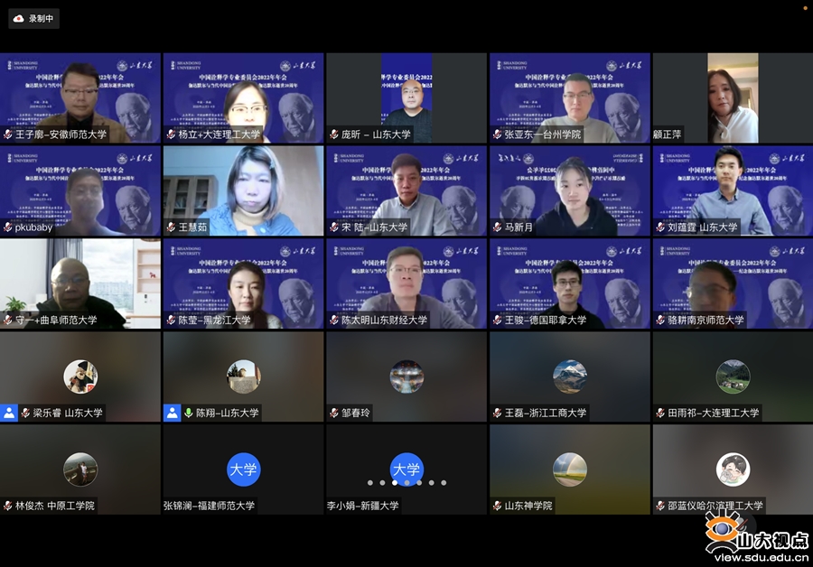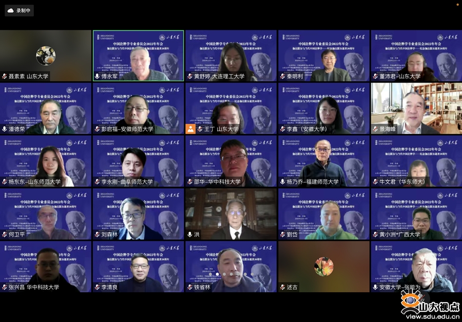 [本站讯]12月3日至4日,由中国诠释学专业委员会、山东大学中国诠释学研究中心、山东大学哲学与社会发展学院主办,华东师范大学诠释学研究所、华东师大“中国诠释学”上海社科创新研究基地、华中科技大学解释学研究中心暨伽达默尔文献馆协办的中国诠释学专业委员会2022学术年会在线上举行。今年是著名哲学家伽达默尔逝世20周年,中国诠释学专业委员会以“伽达默尔与当代中国诠释学”为主题,来自北京大学、清华大学、山东大学、复旦大学、华中科技大学、中山大学、华东师范大学、中国社科院大学、大连理工大学、湖南大学、安徽大学、黑龙江大学、南京师范大学、深圳大学、山东师范大学、广西大学、曲阜师范大学、安徽师范大学、山东财经大学、南方医科大学、华东理工大学、山东省委党校、台州学院、韶关学院等近30多所高校及科研机构的学者出席会议,就伽达默尔与诠释学的未来、中国诠释学的创造性构建、中国诠释学的多元探索、西方诠释学的多维发展、艺术的诠释学向度与现代性、诠释学与实践智慧、中国经典诠释之审思、诠释学的新视域等话题展开讨论。