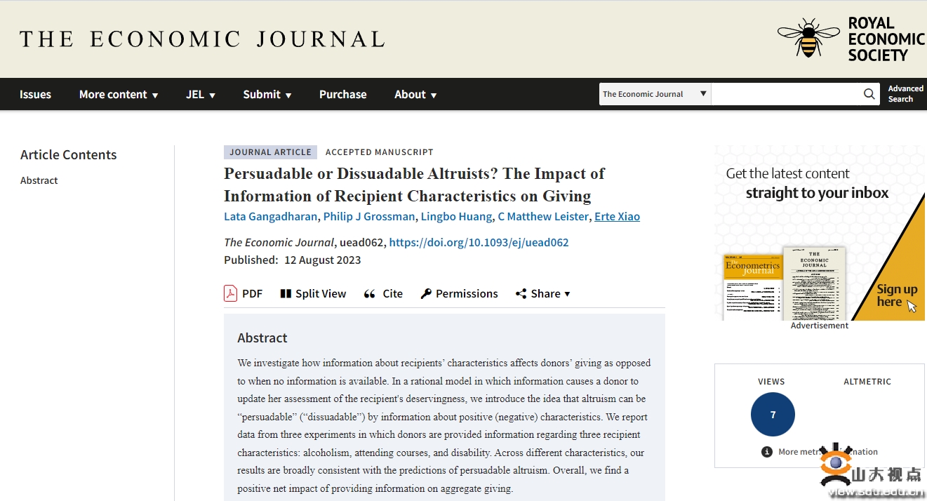 [本站讯]近日,经济研究院教授黄凌波以共同第一作者和通讯作者身份完成的学术论文“Persuadable or Dissuadable Altruists? The Impact of Information of Recipient Characteristics on Giving”在经济学领域国际顶级期刊The Economic Journal在线刊登。合作者为来自澳大利亚莫纳什大学Lata Gangadharan、Philip J Grossma、C Matthew Leister、Erte Xiao。