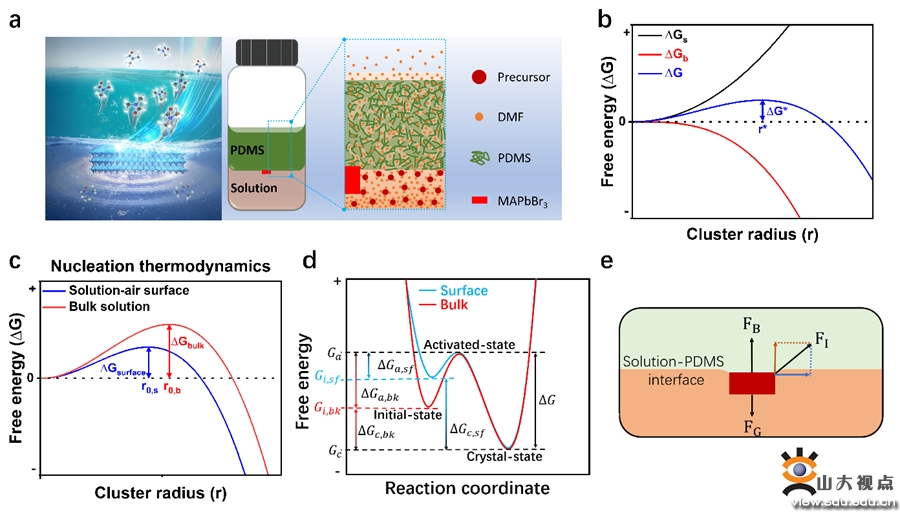 图1. MAPbBr3钙钛矿结晶与晶体生长。(a) PDMS辅助结晶原理图;(b)形核半径与自由能的关系;(c)溶液的表面和内部的形核半径的比较;(d)生长过程中自由能变化图解;(e)界面悬浮生长的力学图解。
