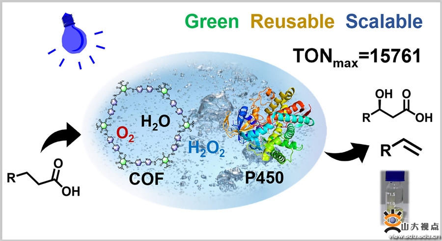 [本站讯]近日,微生物技术国家重点实验室李盛英教授团队和西湖大学张彪彪助理教授团队合作,通过将光催化剂COF-TfpBpy介导的光合H2O2与P450过加氧酶的H2O2依赖性酶活相结合,建立了一个全新的人工光酶级联催化系统,在空气、水和光照条件下实现脂肪酸到1-烯烃和羟基脂肪酸的绿色转化。相关研究结果以“Photoenzymatic synthesis of 1-alkenes and hydroxyl fatty acids by cascading a COF photocatalyst and P450 peroxygenases”为题,发表在自然科学综合类期刊《科学通报》(Science Bulletin)。微生物技术国家重点实验室博士后蒋媛媛、西湖大学博士研究生李培凤为论文共同第一作者,李盛英教授、张彪彪助理教授为共同通讯作者,山东大学微生物技术国家重点实验室为第一完成单位和通讯作者单位。