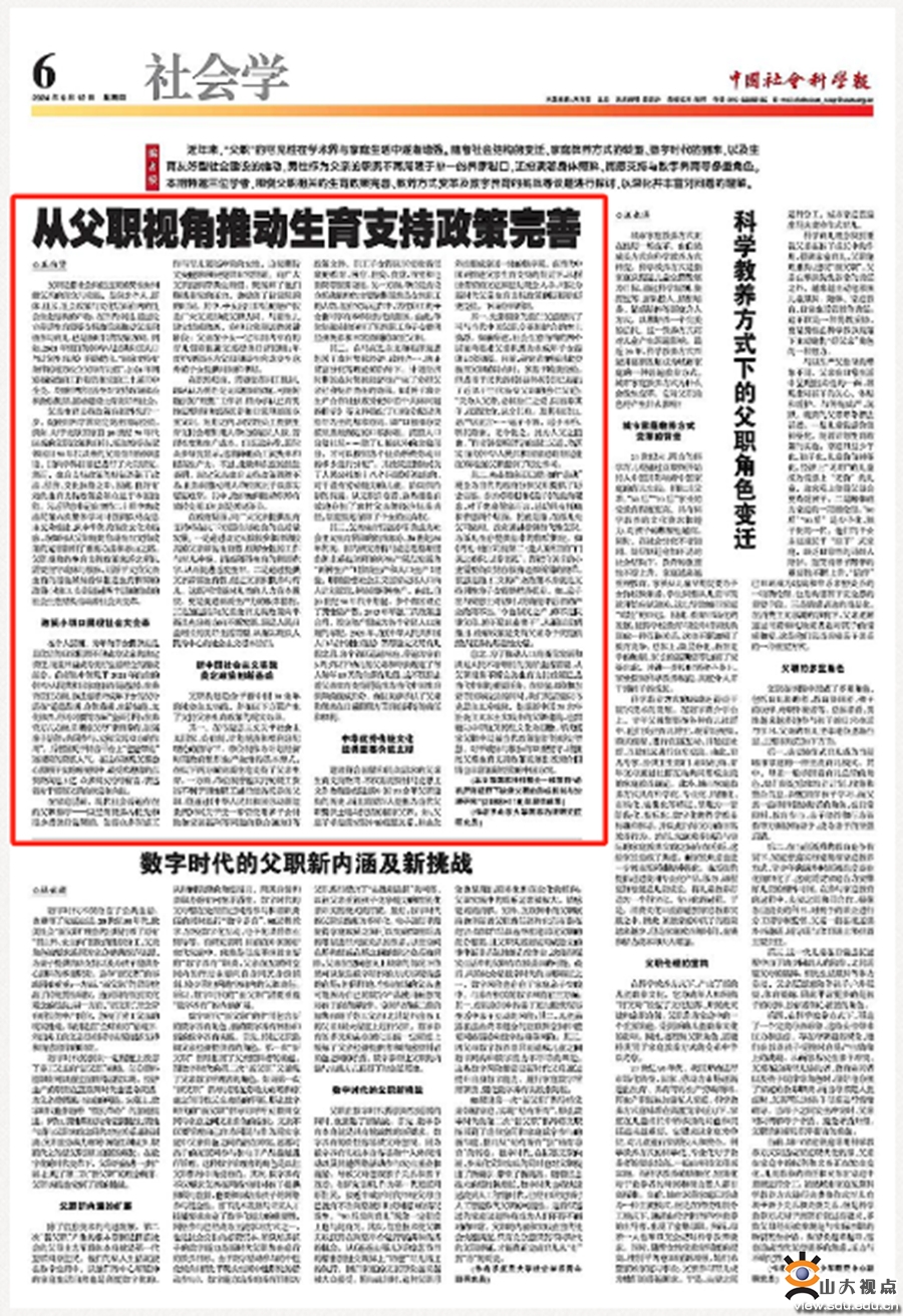 [本站讯]近日,哲学与社会发展学院王向贤教授在《中国社会科学报》2024年9月12日A06版发表理论文章《从父职视角推动生育支持政策完善》,并获《中国社会科学报》头版推送和中国社会科学网和中国社会科学杂志社公众号“中国学派”全文转载。