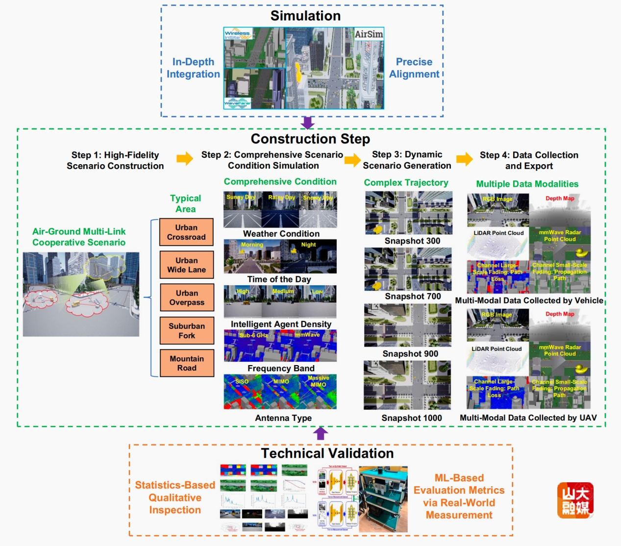 随着人工智能(AI)与网联智能的迅猛发展,无人系统研发如火如荼,旨在大规模智能体利用多模态感知信息,借助网联协同进行信息共享决策,在复杂动态环境中执行多样化智能任务。作为AI算法研究的基础,一个完备的通信与多模态感知数据集必不可少。然而,现有的公开数据集数据模态有限,难以满足前沿通信与多模态感知智能融合研究的实际需求。为填补这一领域的空白,研究团队开发了一个全新的通信与多模态感知数据生成与采集平台,并基于该平台构建并发布了首个完备的通信与多模态感知智能融合数据集SynthSoM。该数据集包含了37.3万组通信信道数据、23万组毫米波雷达波形数据、45.5万张RGB图像、89.1万张深度图像及24.1万组激光雷达点云数据,为多模态数据融合及相关算法验证提供了重要的数据支持。