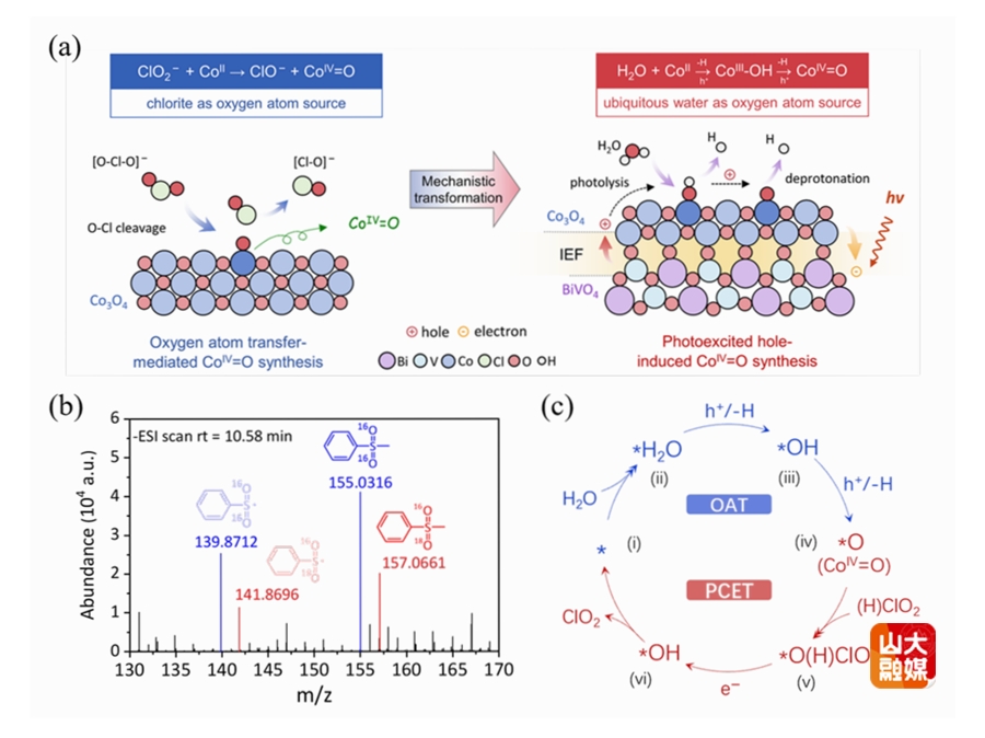 高价钴物种(CoIV=O)是催化化学中的关键中间体,但由于钴中心与氧配体存在电子斥力,CoIV=O难以高效、温和地合成。该团队报道了一种以水为氧原子源,利用光激发空穴诱导过程在催化剂表面合成CoIV=O的新方法。在内电场的驱动下,光激发空穴被定向转移至催化剂表面,将吸附H2O分解为钴配位羟基,并去质子化形成CoIV=O。光催化氧化与亚氯酸盐活化之间形成协同效应,增强了对难降解有机污染物的去除。本工作提出了利用水分子和阳光合成表面高价金属物种的可行策略,这对于突破化学氧化合成高价金属的传统方式、降低氧化剂消耗具有现实意义。相关成果以“Photoexcited Hole-Enabled Synthesis of Surface High-Valent Cobalt-Oxo Species with Water as the Oxygen Atom Source for Water Purification”为题发表于国际期刊Angew. Chem., Int. Ed.。环境学院博士研究生苏瑞典为论文第一作者,李倩教授为通讯作者,山东大学为第一完成单位和独立通讯作者单位。