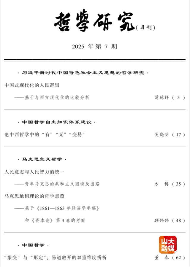 [本站讯]近日,山东大学易学与中国古代哲学研究中心董春副教授在《哲学研究》2025年第7期上发表了题为《“象变”与“形定”:易道敞开的双重维度辨析》的高质量论文。