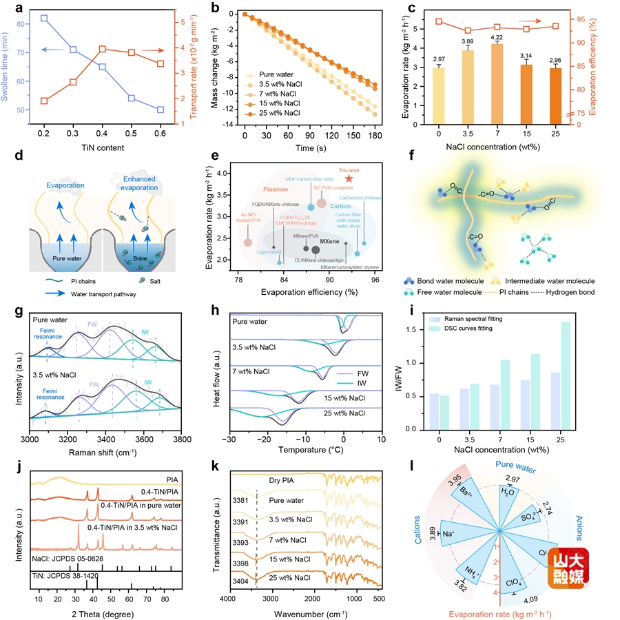 图1.TiN/PIA可调的水输运特性、太阳能驱动的界面淡化性能和离子介导的水活化行为。