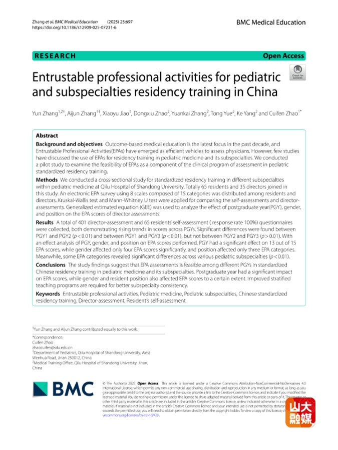 [本站讯]近日,山东大学齐鲁医院小儿内科团队关于置信职业行为在儿科住院医师规范化培训中的应用研究成果,在国际知名高水平期刊《BMC Medical Education》(JCR1区)发表。该研究依托医院住院医师规范化培训创新性研究专项完成。