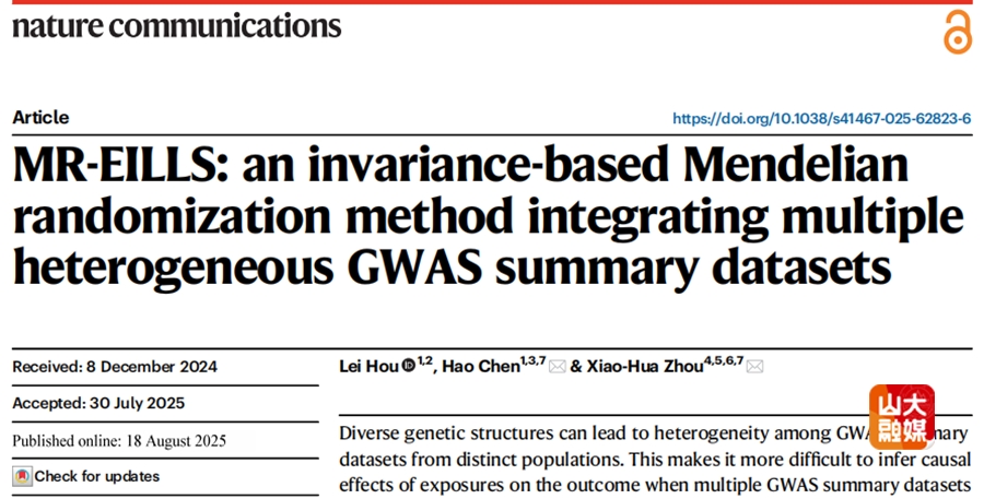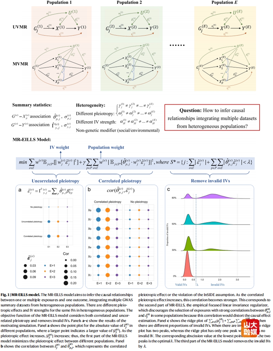 [本站讯]近日,山东大学公共卫生学院/国家健康医疗大数据研究院薛付忠教授团队在国际顶尖期刊Nature Communications(最新影响因子为16.6,中科院一区Top期刊,JCR分区1区)杂志上在线发表了题为“MR-EILLS: an invariance-based Mendelian randomization method integrating multiple heterogeneous GWAS summary datasets”的因果推断方法文章。国家健康医疗大数据研究院/山东大学公共卫生学院侯蕾副研究员为本论文的独立第一作者,山东大学生物统计学系陈昊助理研究员和北京大学生物统计系主任周晓华教授为共同通讯作者。