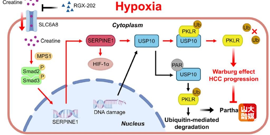 由DNA损伤驱动的PARP1依赖性细胞死亡(parthanatos)是组织稳态和肿瘤发生的关键调控机制,而缺氧是实体肿瘤的典型特征,会显著影响癌细胞的恶性表型。李涛教授团队发现在缺氧的肿瘤微环境中,肝癌细胞通过积累肌酸来逃避parthanatos,从而促进肝癌进展。尽管缺氧会导致DNA损伤,但肝癌细胞却能够抵抗由此引发的parthanatos,关键机制在于肌酸转运蛋白SLC6A8的活跃表达,促使细胞内肌酸蓄积,进而触发代谢重编程,帮助肝癌细胞在缺氧条件下存活并增强侵袭能力。深入分析发现,肌酸通过激活MPS1/Smad2/3信号通路,上调SERPINE1的表达,并与HIF-1α形成正反馈循环,最终稳定促癌蛋白PKLR,使肝癌细胞逃避死亡命运。研究团队还发现靶向SLC6A8的抑制剂RGX-202在临床前实验中表现出显著的抗肿瘤效果,无论是单药还是与靶向药仑伐替尼联用,均能有效抑制肝癌生长,这一发现揭示了靶向肌酸代谢通路的治疗策略,为肝癌精准治疗开辟了新的研究方向。研究成果“Hypoxia-Induced Creatine Uptake Reprograms Metabolism to Antagonize PARP1-Mediated Cell Death and Facilitate Tumor Progression in Hepatocellular Carcinoma”发表于Cancer Research。博士研究生李睿哲和博士后潘国强为共同第一作者,肝胆外科李涛教授和董兆如教授为共同通讯作者。