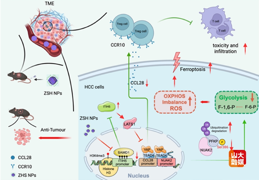 肿瘤微环境的免疫抑制和代谢重编程是制约肝癌免疫治疗效进一步提高的关键因素。李涛教授团队发现肝癌中高表达的SAMD1蛋白是影响治疗效果的关键分子之一。SAMD1既通过调控NUAK2/PFKP通路维持糖酵解代谢,又通过CCL28介导的Treg细胞招募营造免疫抑制环境。该团队首次揭示了通过靶向SAMD1调控NUAK2/Hippo通路抑制PFKP Ser386磷酸化,促进糖代谢从糖酵解转向氧化磷酸化,从而增强铁死亡敏感性和减少Treg细胞浸润的机制。团队利用ATP/酸响应性纳米颗粒递送siRNA,证实靶向SAMD1可通过双重调控代谢和免疫微环境显著提高靶向及免疫联合治疗的抗肿瘤效果,有望为晚期肝癌患者提供更优治疗选择。研究成果“Targeting SAMD1 enhances the effect of anti-PD-1 plus lenvatinib therapy in hepatocellular carcinoma by increasing ferroptosis sensitivity and immune response”发表于Metabolism。肝胆外科博士研究生潘国强、博士后阎钰钏和博士研究生李睿哲为共同第一作者,肝胆外科李涛教授和董兆如教授为共同通讯作者。