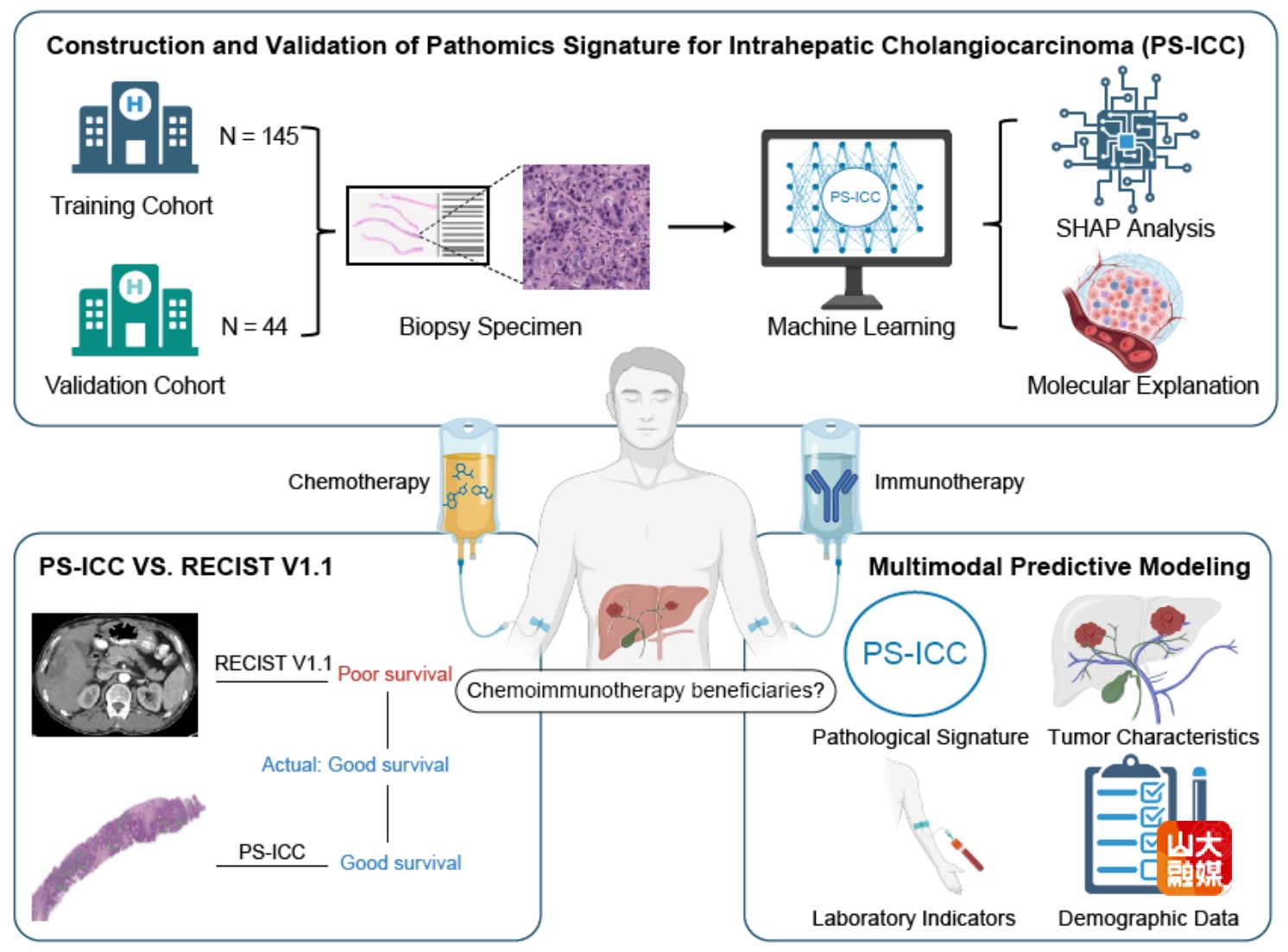 肝内胆管癌(ICC)是起源于肝内胆管上皮的高度侵袭性肝脏恶性肿瘤,晚期患者的5年生存率低于10%。化疗联合免疫治疗已被纳入临床指南,成为晚期ICC的一线治疗选择。但临床中仍有约40%患者存在原发耐药,如何在治疗前精准预测患者对化疗免疫联合治疗的应答一直是临床面临的挑战。李涛教授团队近日成功开发并验证了一种整合病理组学的多模态预测模型(PS-ICC),为不可切除ICC患者的化疗免疫治疗疗效评估提供了全新工具。该团队基于一线化疗免疫联合治疗患者的术前活检样本,通过人工智能机器学习从H&E染色数字病理图像中提取深层特征构建了PS-ICC评分系统,该模型能显著区分治疗获益人群,对患者总生存期具有显著预测价值,较传统RECIST 1.1评估标准更早、更准确地预测患者生存获益。进一步研究发现,PS-ICC低分患者的肿瘤微环境呈现显著异质性:M0型巨噬细胞浸润不足,PD-L1/PD-1免疫检查点通路活性降低,从机制上证实了该模型的生物学合理性。研究成果“Pathomics-Integrated Multimodal Model Evaluate Chemoimmunotherapy Efficacy in Unresectable Intrahepatic Cholangiocarcinoma”发表于JHEP Reports。肝胆外科硕士研究生曹启航和李涵为共同第一作者,肝胆外科李涛教授和王东旭副教授为共同通讯作者。