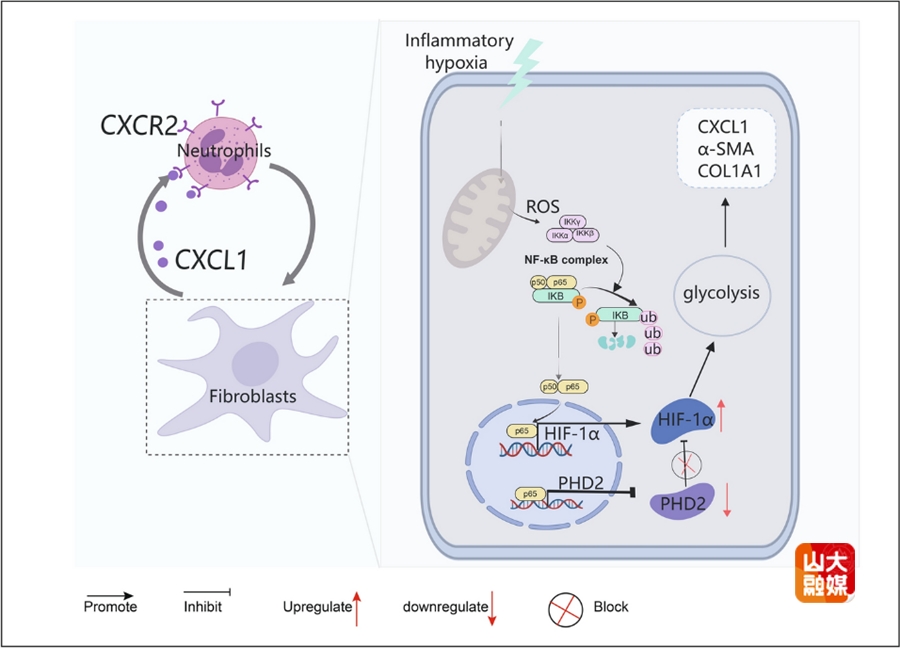 急性胰腺炎(AP)是临床上最常见的急腹症之一,胆结石导致的胆源性胰腺炎是AP的最主要类型。免疫细胞介导的机体过度炎症反应是AP发生进展的主要机制,而中性粒细胞募集是AP发展的关键因素。李涛教授团队和哈医大一附院合作,聚焦于AP中性粒细胞过度浸润的免疫驱动机制,揭示了成纤维细胞激活在中性粒细胞募集中的关键作用,发现胰腺组织中的中性粒细胞和成纤维细胞在AP中表现出显著的异质性,阐明了缺氧环境下NF-κB-HIF-1α信号通路通过糖酵解促进成纤维细胞分泌CXCL1,从而趋化中性粒细胞浸润加重AP的分子机制。而阻断该信号通路可显著改善AP的炎症反应,为临床治疗AP提供了潜在靶点。研究成果“Immunodynamic axis of fibroblast-driven neutrophil infiltration in acute pancreatitis: NF-κB-HIF-1α-CXCL1”发表于Cellular & Molecular Biology Letters。肝胆外科博士后王强、博士研究生张晓和硕士研究生韩承泷为共同第一作者,肝胆外科李涛教授和哈医大一附院王立一教授为共同通讯作者。