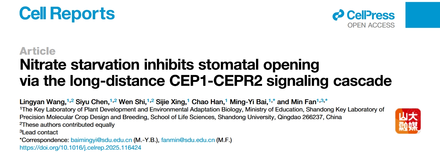 [本站讯]10月16日,生命科学学院白明义/樊敏教授团队在Cell Reports在线发表了题为“Nitrate starvation inhibits stomatal opening via thelong-distance CEP1-CEPR2 signaling cascade”的研究论文,系统揭示了植物在遇到氮贫瘠环境时,通过CEP1–CEPR2长距离信号通路主动抑制气孔开放的分子机制,为“以肥控水”的可行性提供了关键理论依据。