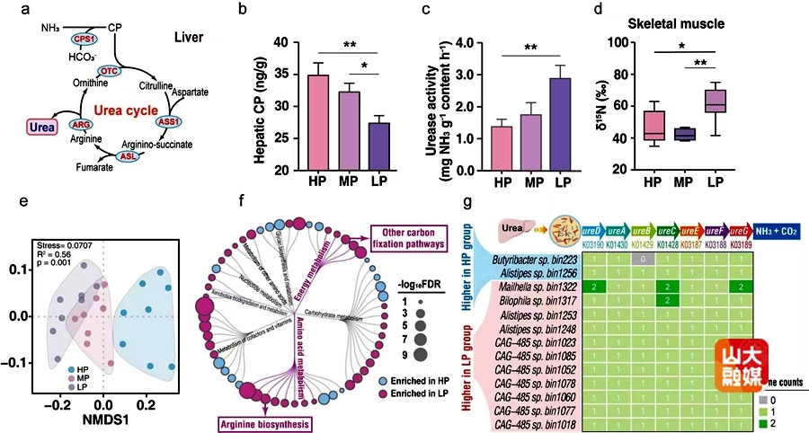 研究结果表明,在冬季蛋白限制条件下,高原鼠兔肝脏中的肝脏尿素循环代谢被抑制,更多的尿素被转运至肠道而非排出体外。同时,低蛋白食物重塑了高原鼠兔的肠道菌群结构和组成,致使高效分解尿素的关键菌(Alistipes)丰度增加(图1)。这些微生物可将肝脏合成的尿素分解为氨(NH3),并进一步合成为氨基酸,最终被鼠兔吸收利用,从而形成高效的“尿素氮循环利用”。