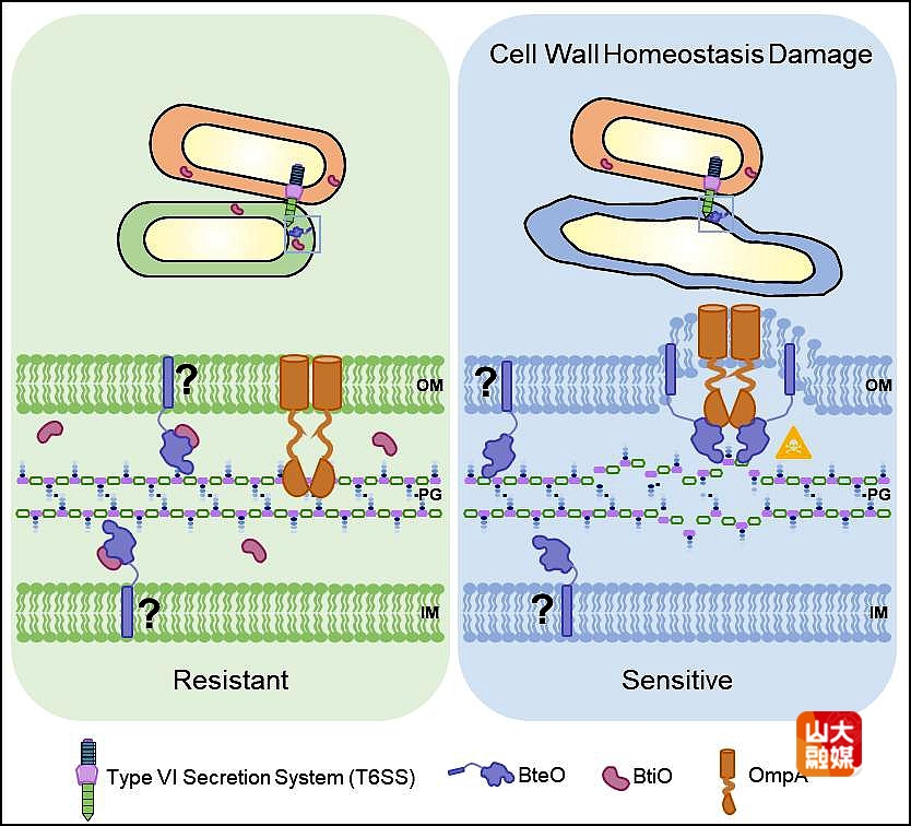 在本研究中,高翔团队对肠道拟杆菌T6SS进行了系统研究,在脆弱拟杆菌T6SS中鉴定出一种新型的效应蛋白BteO。综合运用细胞遗传学、生物化学、结构生物学及生物信息学等方法,作者逐步揭示了BteO独特的作用机制。该效应蛋白与多数已知效应蛋白通过酶解作用直接破坏细胞壁的方式不同,而是靶向结合敏感菌株的OmpAs外膜蛋白,干扰OmpAs与肽聚糖之间的稳定连接,破坏细胞壁的稳定性,从而逐步引发敏感菌株细胞伸长、鼓泡乃至裂解。并且该效应蛋白能够增强细菌在哺乳动物肠道中的竞争定殖能力。另外,肠道内丰富的胆盐能够显著增强BteO的菌间拮抗能力,这为理解肠道微生物在胁迫坏境下的适应性策略提供了新视角。该研究工作报道了一种通过非酶活机制破坏细菌细胞壁,驱动菌间拮抗的新机制。