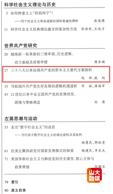 [本站讯]近日,政治学与公共管理学院教授赵婷与中国人民大学国际关系学院博士研究生敖旭(山东大学政治学与公共管理学院2023届中共党史专业硕士毕业生)合作发表在《社会主义研究》2025年第3期的论文《三十八大以来法国共产党的资本主义替代方案探析》被中国人民大学书报资料中心复印报刊资料《世界社会主义运动》2025年第5期全文转载。