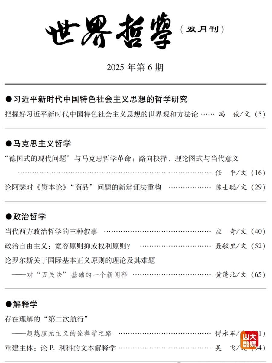 [本站讯]近日,哲学与社会发展学院教授傅永军在《世界哲学》2025年第6期发表了题为《存在理解的“第二次航行”——超越虚无主义的诠释学之路》的论文。