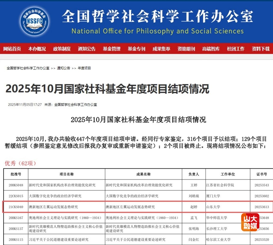 [本站讯]近日,由政治学与公共管理学院、当代社会主义研究所赵婷教授主持的国家社会科学基金青年项目《澳新地区左翼运动发展态势研究》(项目批准号:21CKS040)在国家社科基金结项鉴定中获评“优秀”。这一成果不仅丰富了当前学术界有关澳新地区左翼运动的系统研究,也为世界社会主义运动研究提供了区域国别视角的创新探索,彰显了研究团队扎实的学术功底与前沿的问题意识。
