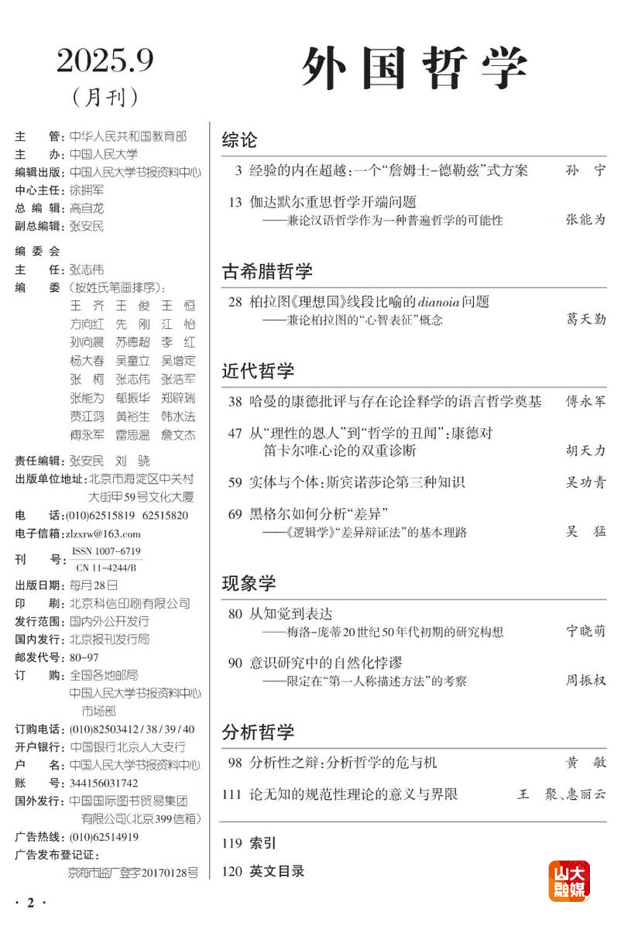 [本站讯]近日,人大复印报刊资料《外国哲学》2025年第9期全文转载了哲学与社会发展学院教授傅永军题为《哈曼的康德批评与存在论诠释学的语言哲学奠基》的论文。