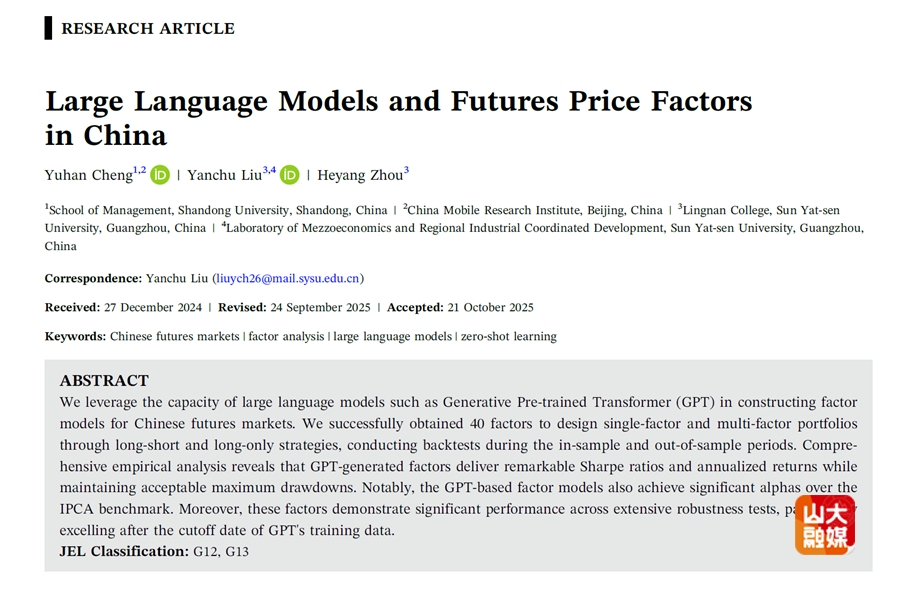 [本站讯]山东大学管理学院助理教授程雨涵与中山大学教授刘彦初、研究生周赫杨的合作文章于金融学领域期刊Journal of Futures Markets正式发表。Journal of Futures Markets为学院A类期刊。