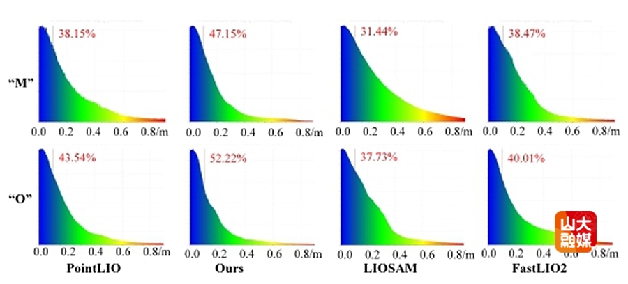 总体而言,本文系统在两种激光雷达的试验中均取得了最低APE(绝对位置误差),在头盔与UGV的轨迹高度重叠的情况下,系统整体提升效果翻倍。为了评估三维地图的精度,选择高精度MLS作为参考地图,该地图是由Alpha3D通过高精度车载惯性导航系统(INS)采集的。与其他现有先进SLAM系统(PointLIO、LIOSAM 和 FastLIO2)相比,我们的系统实现了最佳性能,Ouster 提高了 8.68%、14.49%、12.21%,MID 提高了 9.0%、15.71%、8.68%。更重要的是,用头盔生成的地图进行相同的评估。但由于该平台的运动剧烈,只有PointLIO能够获得满意的结果,而FastLIO2和LIOSAM则遇到严重漂移。实际建图精度比较如图5所示,比我们的系统下降了 11.11%。