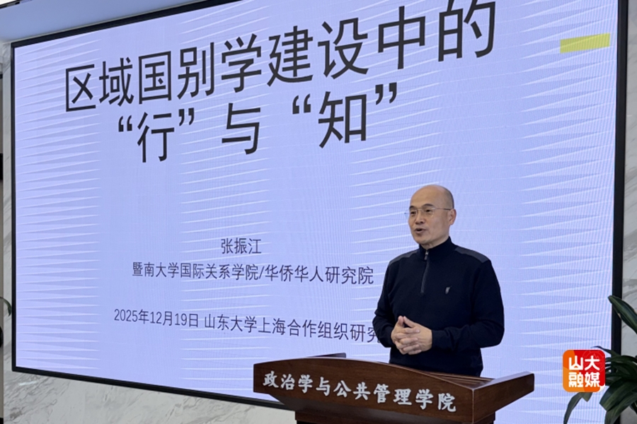 [本站讯]12月19日,由山东大学政治学与公共管理学院、山东大学上海合作组织研究院、山东大学公共安全研究院、中国—上海合作组织经贸学院联合主办的“合作与发展”系列讲座第三十四期在山东大学青岛校区举行。暨南大学国际关系学院与华侨华人研究院教授、教育部人文社科重点研究基地主任、C刊《东南亚研究》主编张振江担任主讲嘉宾,作主题为“区域国别学构建中的‘知’与‘行’”的报告。山东大学特聘教授、泰山学者特聘专家、上海合作组织研究院执行院长盛力主持讲座。