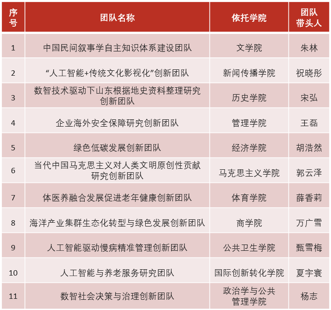 “青年创新团队计划”由山东省教育厅组织设立,支持35周岁以下的青年学者联合省内外、校内外、高校和企业智力资源组建研究团队,同时将本团队科研成果通过多种方式转化为教学资源,推动科研育人。本年度遴选的人文社科类团队以构建中国自主知识体系为目标,聚焦中国式现代化实践中的重大问题,依托跨学科融合机制与大数据、人工智能等新技术手段开展研究。截至目前,山东大学共有49支团队获批立项为山东省高等学校“青年创新团队计划”团队,研究周期为三年,其中4支团队已经完成验收,顺利结项。
