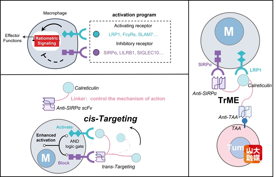 免疫细胞衔接器是一类可桥接免疫细胞与肿瘤细胞并引导免疫细胞定向杀伤肿瘤的新型治疗策略。尽管其在血液肿瘤中已取得显著疗效,但在实体瘤中的应用仍受限于免疫抑制性微环境,尤其是免疫细胞活化不足。巨噬细胞作为实体瘤中高度富集的关键免疫细胞,其吞噬功能依赖促吞噬与抗吞噬信号的动态平衡。现有治疗策略多仅增强或阻断单一信号,难以在巨噬细胞内实现多信号的协同整合,导致激活不足,疗效受限。