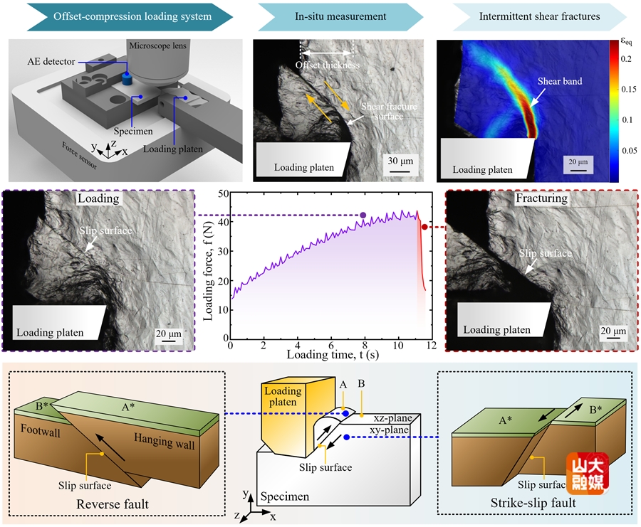 团队创新性地提出将显微直角切削作为一种材料加载方法,开发了结合光学、声学和力学原位测量的显微切削原位测试平台。在镁合金直角切削过程中,捕捉到能够自发演变的突发性和间歇性的剪切断裂行为。利用力信号和显微原位图像信息,发现镁合金的间歇性剪切断裂行为具有与走滑断层和逆断层相同的运动学和力学特征,并且呈现出自组织临界特性。同时,在声发射信号中,监测到间歇性剪切断裂具有与孤立型地震活动相同的能量释放特征,并且在连续的剪切断裂事件中统计到了地震学的基本规律——古登堡-里克特定律。该研究表明,金属切削过程中的间歇性剪切断裂可以作为一种可控的实验系统,用于模拟断层滑移以及孤立地震等复杂自然现象。