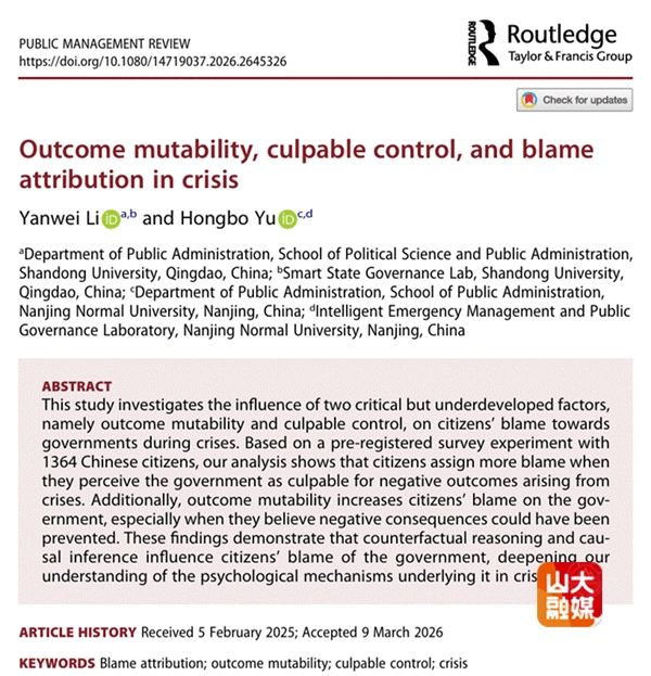 近日,政治学与公共管理学院李延伟教授作为第一作者在公共管理顶级期刊《Public Management Review》(PMR)在线发表题为《Outcome mutability, culpable control, and blame attribution in crisis》的学术论文。