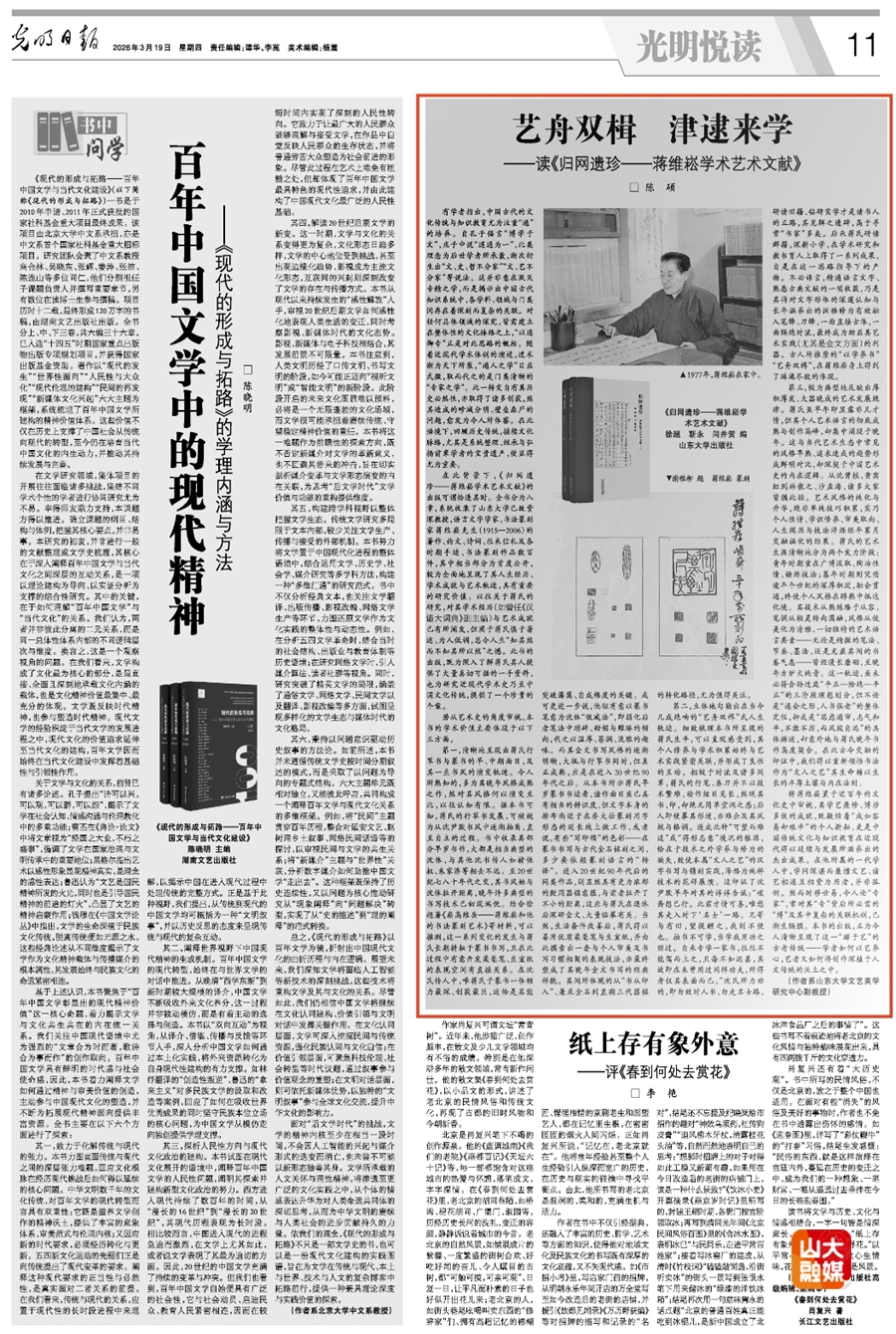 [本站讯]近日,文学院陈硕副教授在《光明日报》发表题为《艺舟双楫 津逮来学——读〈归网遗珍——蒋维崧学术艺术文献〉》的学术文章。