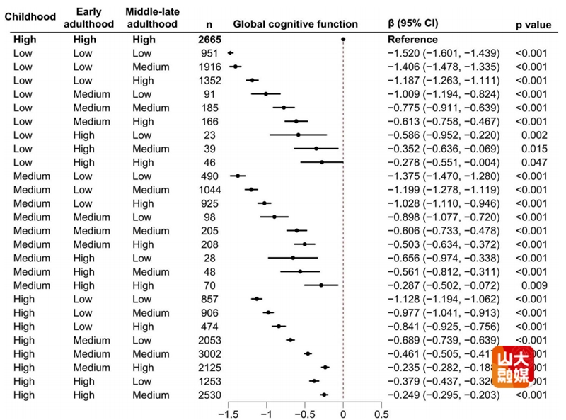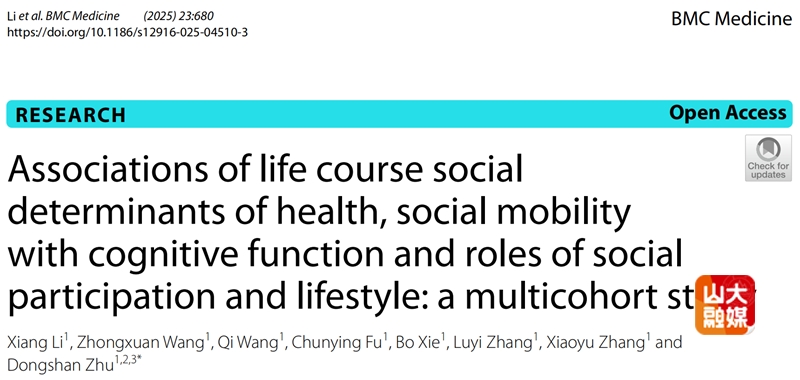 团队在BMC Medicine发表题为“Associations of life course social determinants of health, social mobility with cognitive function and roles of social participation and lifestyle: a multicohort study”的研究论文。该研究整合美国健康与退休研究(HRS)、中国健康与退休纵向研究(CHARLS)和英国老龄化纵向研究(ELSA)三项代表性纵向队列数据,发现生命周期中累积社会劣势程度较高与较差的认知功能和更快的认知衰退速率有关。各生命阶段SDOH持续处于低水平者认知表现最差,而童年SDOH优势、成年后转为劣势的下行社会流动人群其认知衰退尤为显著。研究进一步表明,社会参与与健康生活方式在上述关联中具有一定的中介与缓冲作用。该研究从生命历程视角出发,揭示了认知老化的重要社会健康基础,为高风险人群的早期识别及相关干预策略的制定提供了重要科学依据。该文以山东大学为第一和通讯作者单位,公共卫生学院2023级硕士研究生李响为本文第一作者,朱东山教授为唯一通讯作者。