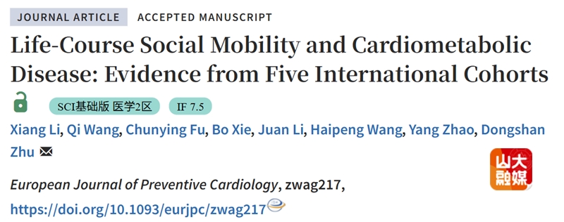 团队采用多队列整合研究设计,在European Journal of Preventive Cardiology发表题为“Life-Course Social Mobility and Cardiometabolic Disease: Evidence from Five International Cohorts”的论文。本研究基于五个国际纵向队列数据,发现全生命周期各阶段及累积SDOH水平较低者发生CMDs的风险显著升高,其中童年低水平SDOH与糖尿病风险升高相关,而中晚年阶段SDOH较低则与CMDs各亚型风险增加一致相关。与全生命周期中持续保持较高SDOH水平的参与者相比,拥有持续低水平、逐渐下降及先升后降社会流动轨迹者的CMDs风险显著增加,其中逐渐下降的流动轨迹与CMDs各亚型风险增加一致相关。进一步分析结果表明,饮酒、体力活动、抑郁症状及社会参与等因素对上述关联具有重要解释作用,且在与心脏病和卒中关联中的贡献更为突出。该研究提示,在心血管疾病防控中除倡导健康生活方式外,还应同步加强心理健康促进,并鼓励个体积极参与社会活动,维持良好的心理状态和社会适应能力。该文以山东大学为第一和通讯作者单位,李响为本文第一作者,朱东山教授为唯一通讯作者。