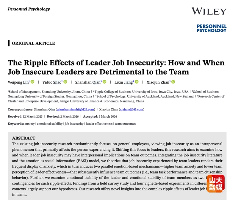 [本站讯]近日,管理学院林伟鹏教授团队的最新研究成果“The Ripple Effects of Leader Job Insecurity: How and When Job Insecure Leaders are Detrimental to the Team”在管理学与应用心理学国际顶尖期刊Personnel Psychology(TAMUGA-8, AJG/ABS-4*, ABDC-A*,JCR Q1)在线发表。