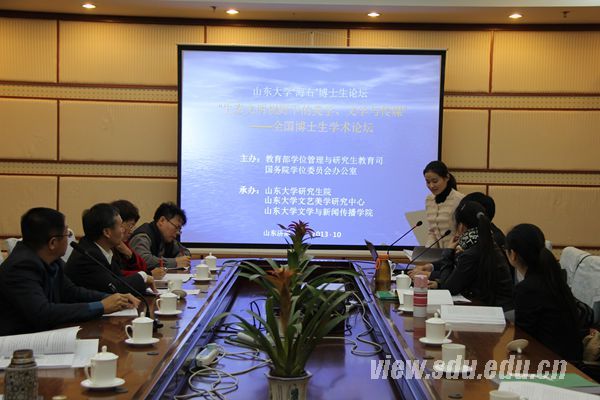 本次论坛由教育部学位管理与研究生教育司、国务院学位委员会办公室主办,山东大学研究生院、山东大学文艺美学研究中心、山东大学文学与新闻传播学院承办。山东大学终身教授、文艺美学研究中心主任曾繁仁教授,台湾中山大学黄心雅教授、中兴大学阮秀莉教授、淡江大学蔡振兴教授、台湾师范大学梁一萍教授、厦门大学王诺教授、山东大学(威海)张红军教授等海峡两岸知名学者为论坛作主题报告并担任点评嘉宾。山东大学文艺美学研究中心常务副主任谭好哲教授和中心程相占教授主持讨论。来自全国各高校多个专业的五十余名博士生就生态文学与生态批评、生态美学和环境审美、生态文明视野下的文艺作品解读及传媒现象研究等若干方向介绍了各自的研究成果。