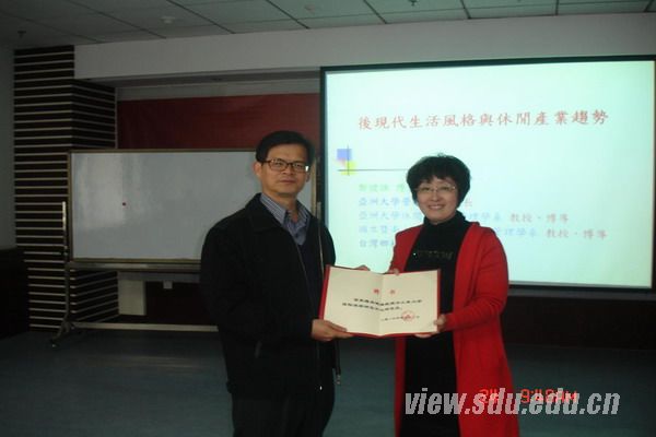 演讲过程中,郑健雄教授与听众进行了饶有趣味的互动交流,其幽默的话语、前沿的理念和系统的论述给大家留下了深刻的印象。管理学院旅游管理系副主任许峰副教授主持讲座,系党支部书记蔄茂兰副教授为郑健雄教授颁发了山东大学国际旅游研究中心研究员聘书。校内外近百名师生聆听了讲座。