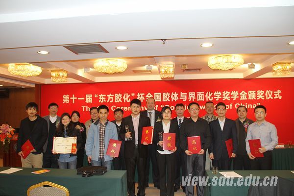 [本站讯]日前,第十一届“东方胶化杯”全国胶体与界面化学研究生奖学金颁奖仪式在北京大学英杰交流中心举行,山东大学2010级博士研究生董人豪、贾寒分别获得一等奖和二等奖,这是山东大学学生首次在全国胶体与界面化学学科领域的研究生科研工作评比中获得一等奖。