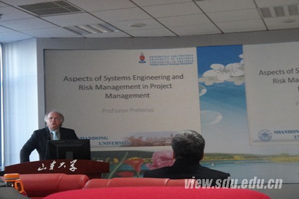 Leon教授针对和国际社会现状和社会需求,对项目经理和系统工程师职业做了职业分析和前景展望,并对同学们的职业规划给出了自己的建议。随后,他就人机系统、房屋系统等大量现实生活中的事例和项目系统中的原理做了对比讲解,生动形象地向同学们介绍了系统工程与风险管理的原理,探讨了两次金融危机背景之下的金融系统工程、风险管理、金融创新及金融监管中的最新学术成果与创新实践。接下来, Leon教授又针对中非的文化差异和商业隔阂等问题,详细介绍了风险管理的适应性和不同国家对于风险管理的采取的政策。最后,现场提问环节中Leon Pretorius教授对同学们提出的问题作了详细的讲解,向同学们介绍了比勒陀利亚大学的人文和历史,并表达了比勒陀利亚大学对同学们的欢迎。