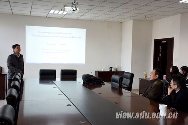 [本站讯]11月3日,经济学院第157期高级经济学讲座在中心校区举行。中南财经政法大学副教授帅杰为经济学院师生带来了题为“Licensing Essential Patents: The Non-Discriminatory Commitment and Hold-Up”的学术报告。经济学院院长李长英教授出席。