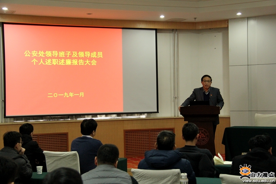 胡长玉代表公安处领导班子进行了述职汇报,全面总结了公安处取得的各项成绩。在2018年,领导班子把党建工作摆在首位,发挥党支部战斗堡垒作用;提高政治站位,做好意识形态工作;协助学校做好校园安全工作顶层设计,构建学校大安全格局;坚持安全关口前移和基础强化工作,构筑校园公共安全防范体系;深化放管服改革,强化为师生服务的宗旨意识。2018年校园整体安全环境再上新台阶,荣获济南市首批命名的五星级“平安单位”。胡长玉表示,虽然公安处在维护校园安全稳定工作中取得了一些成绩,但在应对严峻的政治安全形势、提高师生安全意识、完善安全工作的责任体系和奖惩制度以及消防、治安、交通管理方面仍面临一些问题和挑战。2019年,公安处将在巩固现有成绩的基础上,加强学习,勇于担当,团结进取,努力提高政治站位,建设政治过硬、业务过硬、作风过硬的校园安保团队;进一步完善安全责任体系和安全管理制度;继续构筑较为完善的校园公共安全防范体系和治安防控体系;加强安全教育及法制宣传力度,与相关部门通力协作,合力构建安全教育体系,打造校园安全文化,在校园“大安全”的安全管理理念下,力争为学校创建世界一流大学的宏伟目标提供更为过硬的安全保障,为广大师生医务员工提供更为优质高效的安全服务。