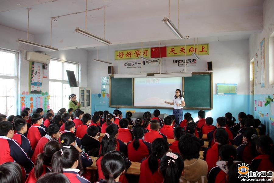 在泉源镇五湖小学,陈向阳代表山东大学向泉源镇中学和五湖小学捐助电脑50台、实物投影仪9台。随行的国际教育学院师生在五湖小学开展了“国风焕韵”传统文化浸濡活动,从孔子《论语》导入,利用竹简等教具,通过汉服体验和生肖拓片等教学,使中华优秀传统文化更好地走进乡村小学。同时,来自“一带一路”沿线国家泰国、马达加斯加、尼日利亚和土库曼斯坦的4名国际学生,走进五湖小学教室与小学生开展文化交流活动,通过展示各自国家风土人情和文化语言介绍、泰拳表演、民族舞蹈等,开阔农村孩子视野,深受学生欢迎。