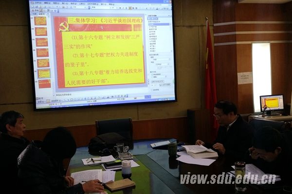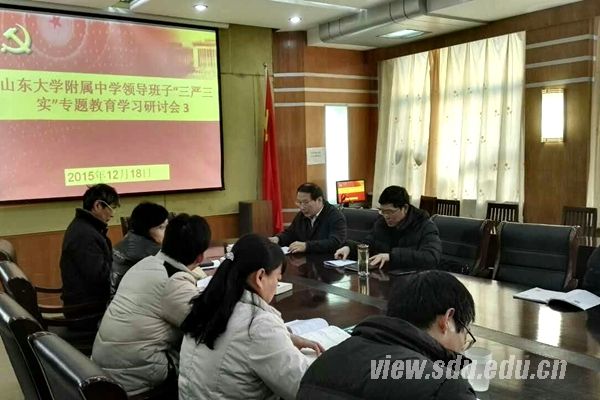 会议围绕着“严以用权,真抓实干,实实在在谋事创业做人,树立忠诚、干净、担当的新形象”这一主题,开展“三严三实”专题教育第三专题集中研讨。会议的第一阶段,庄晓迎书记介绍了附中开展 “三严三实”专题教育情况。认真传达了山东大学贯彻落实教育部关于违反中央八项规定典型案例通报会议精神,并组织学习了贯彻《中国共产党廉洁自律准则》和《中国共产党纪律处分条例》两部党内重要法规。会议的第二阶段,庄晓迎书记带领一附中领导班子成员集体学习了《习近平谈治国理政》的重要精神,重点学习了第十六专题“树立和发扬‘三严三实’的作风”,第十七专题“把权力关进制度的笼子里”和第十八专题“着力培养选拔党和人民需要的好干部”等三个专题内容。