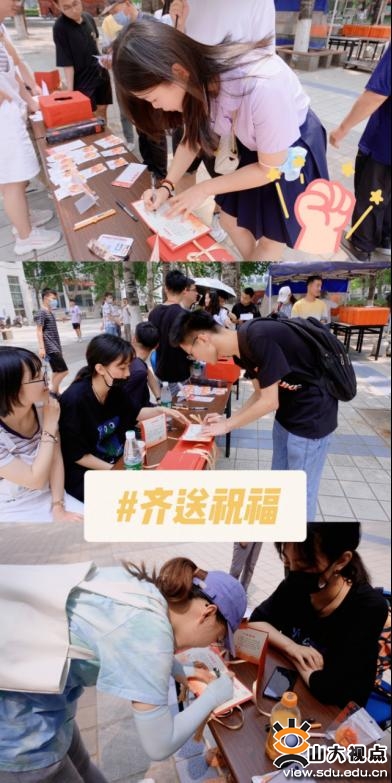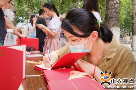 随着“七一”临近,连日来,山东大学校内庆祝建党百年氛围越来越浓厚,“红色元素”线上线下送祝福活动就在这样热烈的氛围中应运而生。活动伊始,研究生党员代表就在展板前带领参加活动的党员重温入党誓词,将现场气氛带向一个高潮。活动现场设置了党史竞答抽奖等互动活动,工作人员引导来往同学积极参与,意义深刻而富有趣味的活动形式迅速吸引了研究生党员们的参与热情。