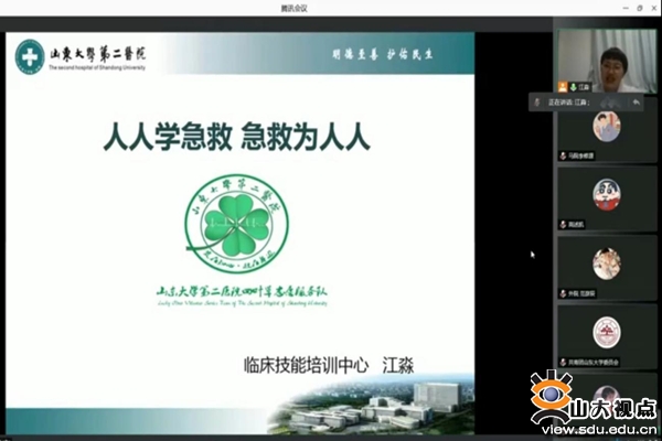 山东大学第二医院临床技能培训中心护士长江淼讲授了志愿服务一般性技能及应急救护技能。江淼强调“人人学急救,急救为人人”,她从救护原则、创伤处理、心肺复苏术等多个方面展开讲解,并利用模型道具进行线上实践演示。