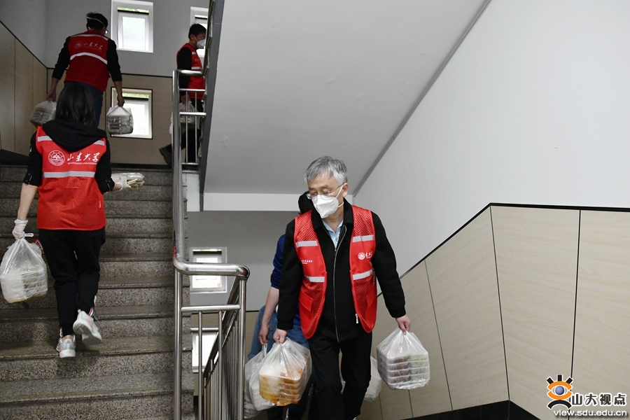 每天上午11点左右、下午四点半左右,教职工志愿者们便放下手中的工作,做好个人防护,穿上红马甲,向食堂和各宿舍楼下汇去。食堂接餐、运送到宿舍楼、核实数据、楼下分餐、上楼送餐,尽管天气微凉,但一两个小时下来,大家还是一身汗水。学生宿舍楼数量多、分布广,有的宿舍楼没有电梯,需要一袋袋提到各楼层,但无论年长的,还是看似“柔弱”的女教职工,大家都争先恐后抢着干,努力以最快的速度将饭菜送到同学们的手中。