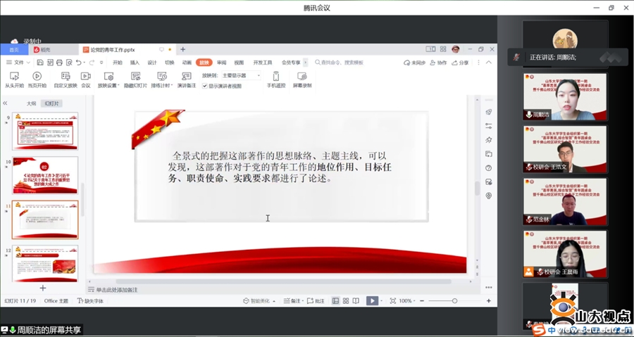 理论学习环节,会议邀请到山东大学习近平新时代中国特色社会主义思想青年学习会副会长周顺洁领学《论党的青年工作》。周顺洁在领学中重点提到共青团作为党的青年工作的骨干力量,必须始终把学懂弄通做实作为主要任务。领学环节切实提高了研究生会成员的思想政治站位和理论素养,为合力探索研究生会工作改革新路径指明了方向。