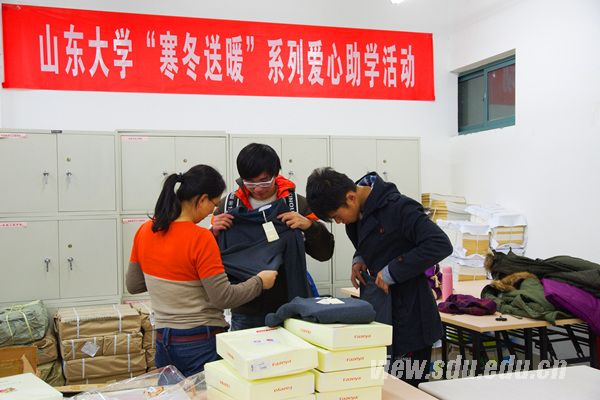 [本站讯]12月2日,山东大学“寒冬送暖”系列活动在中心校区举行,学校向500名家庭经济困难学生发放保暖内衣,带给同学们学校和社会的关怀,呵护他们渡过寒冷的冬季。
