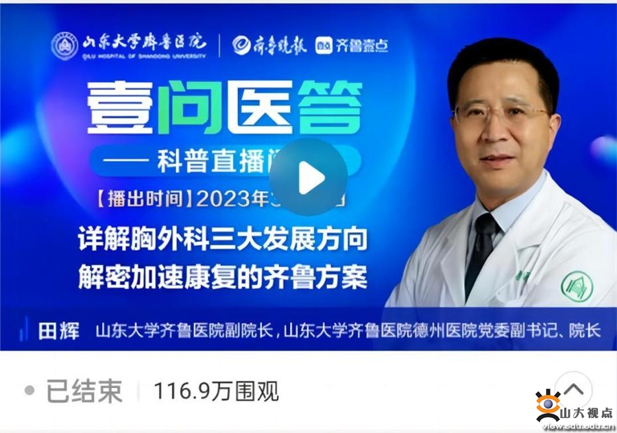 直播通过山东大学齐鲁医院官方微信视频号、抖音、快手、微博、今日头条及齐鲁晚报·齐鲁壹点客户端、新浪、百度、西瓜视频等直播平台进行推送,首期直播全网观看量达116.9万人次。