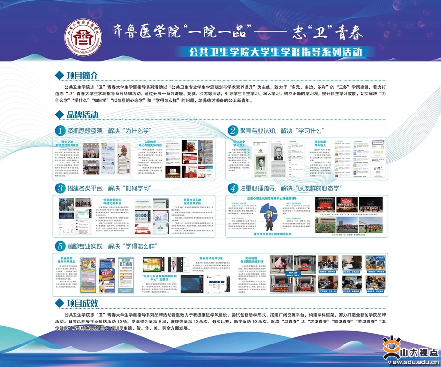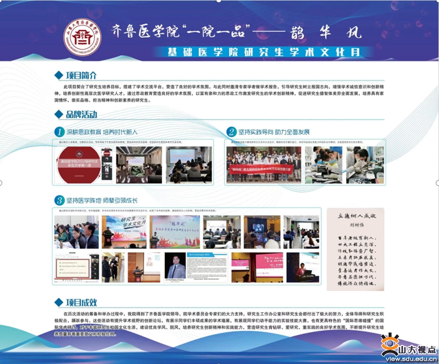 广智求真强学术,坚定医者理想。“一院一品”活动开展过程中,重点加强了学术诚信、学术品格教育,强化学涯指导,坚定学生专业理想,培育医学精英。基础医学院“鹊华风--研究生学术文化月”项目紧扣新时代新使命,聚焦提高基础研究水平,为学生搭建学术交流平台,引导研究生立志学术报国,服务国家重大战略。活动实施至今,学生参与度高、成果丰硕,发挥了较为显著的育人作用。学生在Nature、Cell等世界顶级杂志发表的高水平科研成果不断涌现,参与大项目、大成果团队的学生不断增多,科研成果转化的数额逐步增加。公共卫生学院“志‘卫’青春-大学生学涯指导系列活动”致力于加强“多元、多边、多彩”的“三多”学风建设。截至目前,已开展学业帮扶活动15场,专业提升活动9场,学生成绩稳步提升。疫情防控期间,学院多名本研志愿者主动请缨,成为校园最美逆行者,展现了山大公卫人主动奉献和勇于担当的精神,受到学校和济南市政府的表彰。