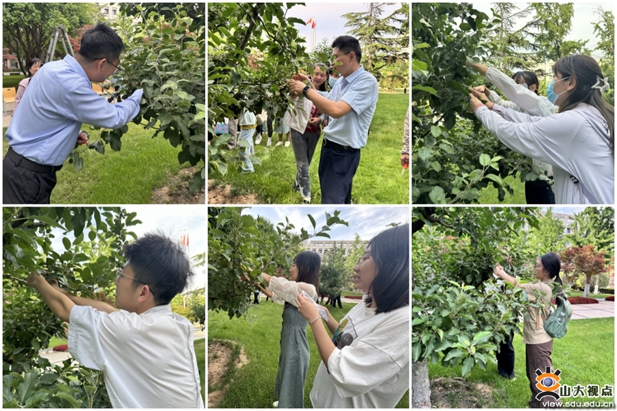 随后,大家来到校园内大成广场的苹果树种植区域,进行实地操作和体验。党员们分成若干小组,亲自参与苹果树的疏果套袋工作。谢东斗向大家演示了正确的疏果方法,他表示要根据果树的生长情况和果实的大小、位置进行选择性疏果,确保留下的果实能够得到充足的养分和光照。他向大家讲解了套袋的步骤和注意事项,如何确保袋子贴合紧密,既能保护果实不受虫害侵扰,又能保证果实的品质和色泽。在实际操作中,党员们和青干班学员表现出了极高的热情和积极性,他们认真观察、仔细操作,互相交流心得。